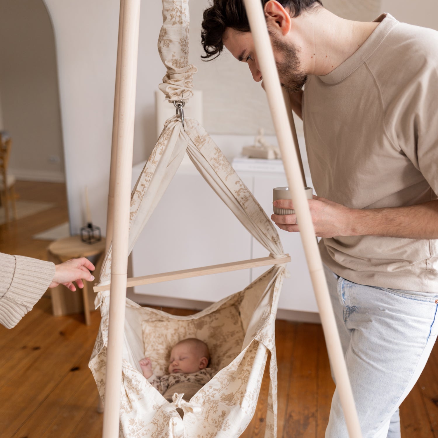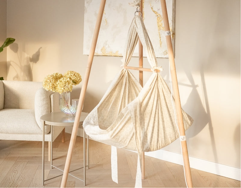 High-quality materials are crucial for your baby's well-being. The Baby Hammock or baby hammock consists of ÖKO-Text certified organic cotton and therefore offers the best quality for sensitive skin. The use of certified materials ensures that your Baby Hammock free from harmful substances iand meets the highest standards. In addition, the breathable mattress promotes a healthy sleeping position, while the combination of untreated wood of the Baby Hammock frame and safe tension spring for stability. So you can be sure that your baby is sleeping in a healthy and safe environment.