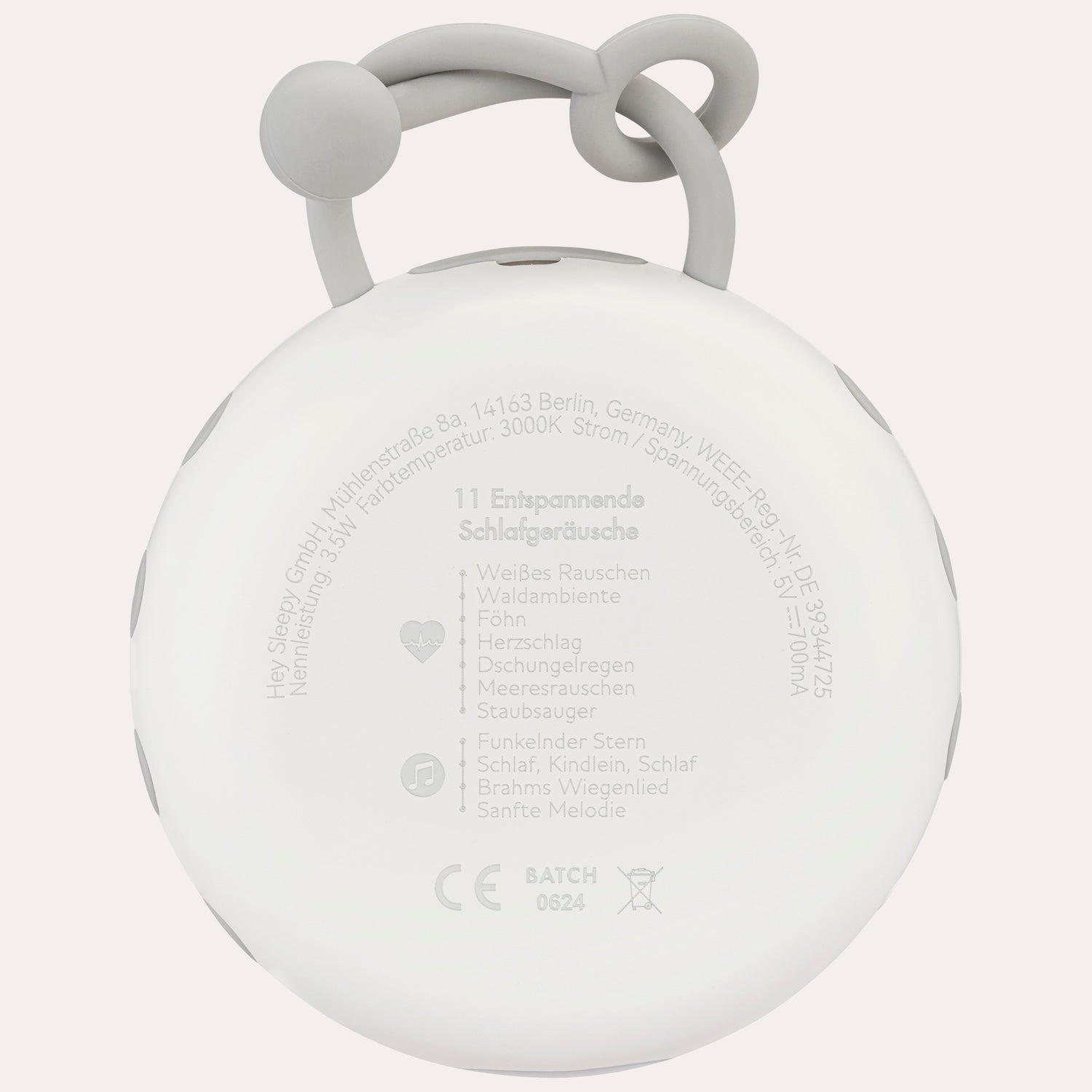 The White Noise speaker is charged using the charging cable supplied and offers a runtime of approx. 30 hours when used purely for sound. If you use the night light at the same time, the runtime is about 20 hours, and if only the light is used, the battery lasts up to 90 hours.